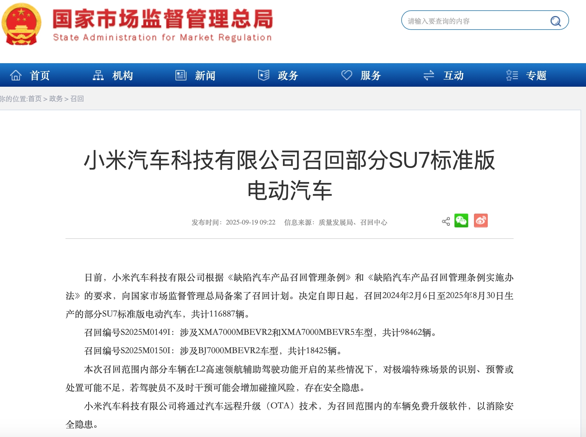 日前旗开网,小米汽车科技有限公司根据《缺陷汽车产品召回管理条例》和《缺陷汽车产品召回管理条例实施办法》要求,向国家市场监督管理总局备案了召回计划。决定自即日起,召回2024年2月6日至2025年8月30日生产的部分SU7标准版电动汽车,共计116887辆。这一消息引发高度关注。