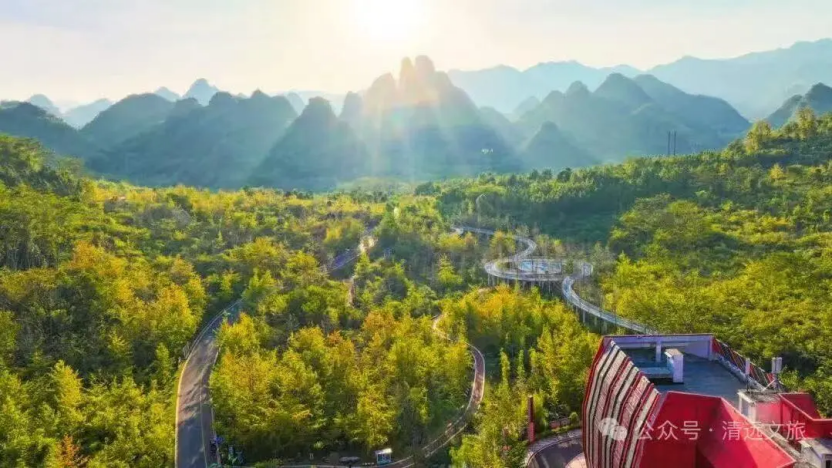 万山朝王观景台 · “1314”廊桥,登临公园制高点,千座石山似万马朝拜盘古王,金黄林海与奇峰异石交相辉映;1314廊桥悬于崖谷,桥上一眼收尽千峰。