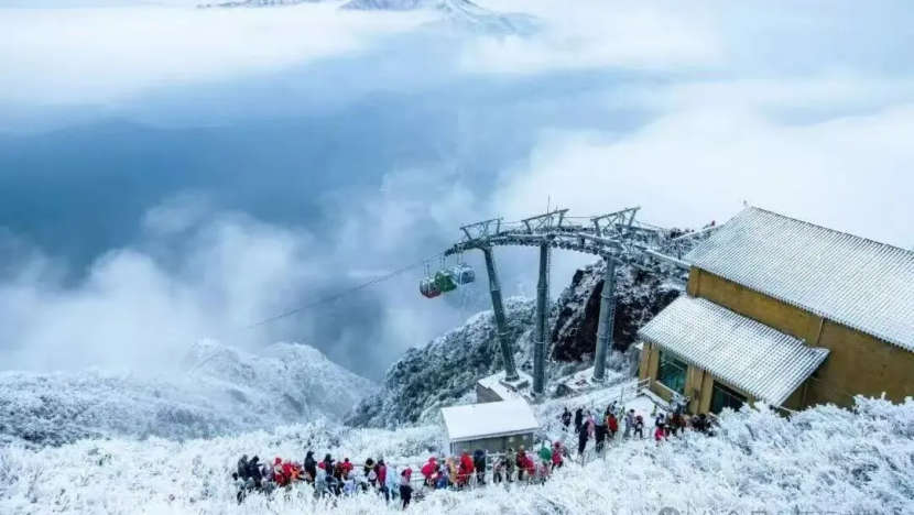金子山位于清远连山壮族瑶族自治县,海拔1417米,是粤桂湘交界处的“天然冰雪箱”。当北方冷空气跋涉到此,遇到南方暖湿气流,便魔术般地创造出漫山遍野的雾凇和冰挂。
